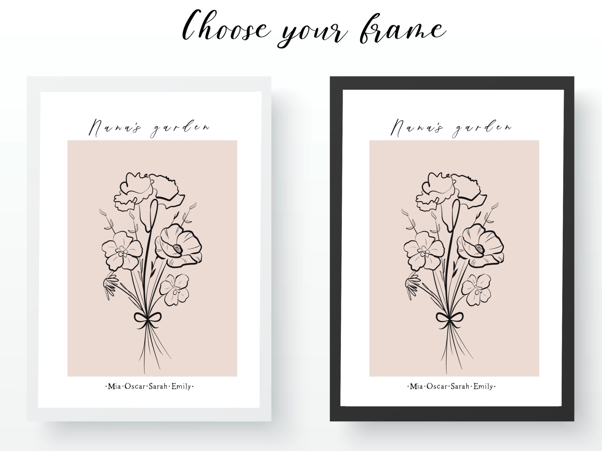 Looking for a heartwarming gift for Grandma to display proudly in her home? Imagine gifting a "Nana’s Flower Garden" print, where each flower represents her grandchild’s birth month. The names of the grandchildren can be added beneath the floral bouquet if wanted.