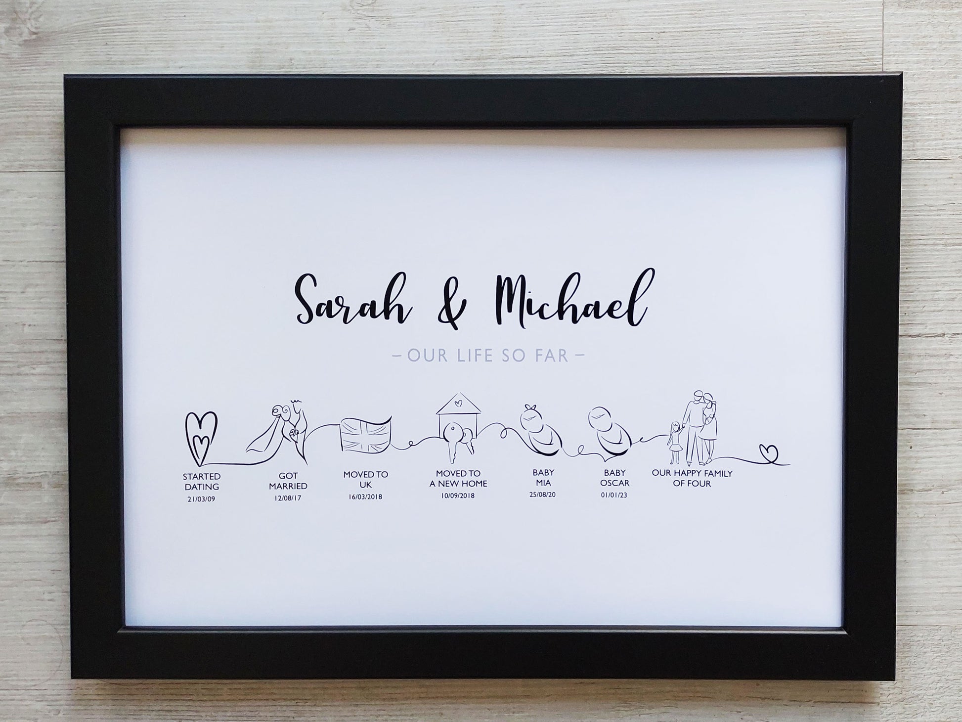 Capture the essence of your life's journey with our exquisite 'Timeline of Our Life' print. Designed with love and attention to detail, this unique keepsake showcases your cherished moments.