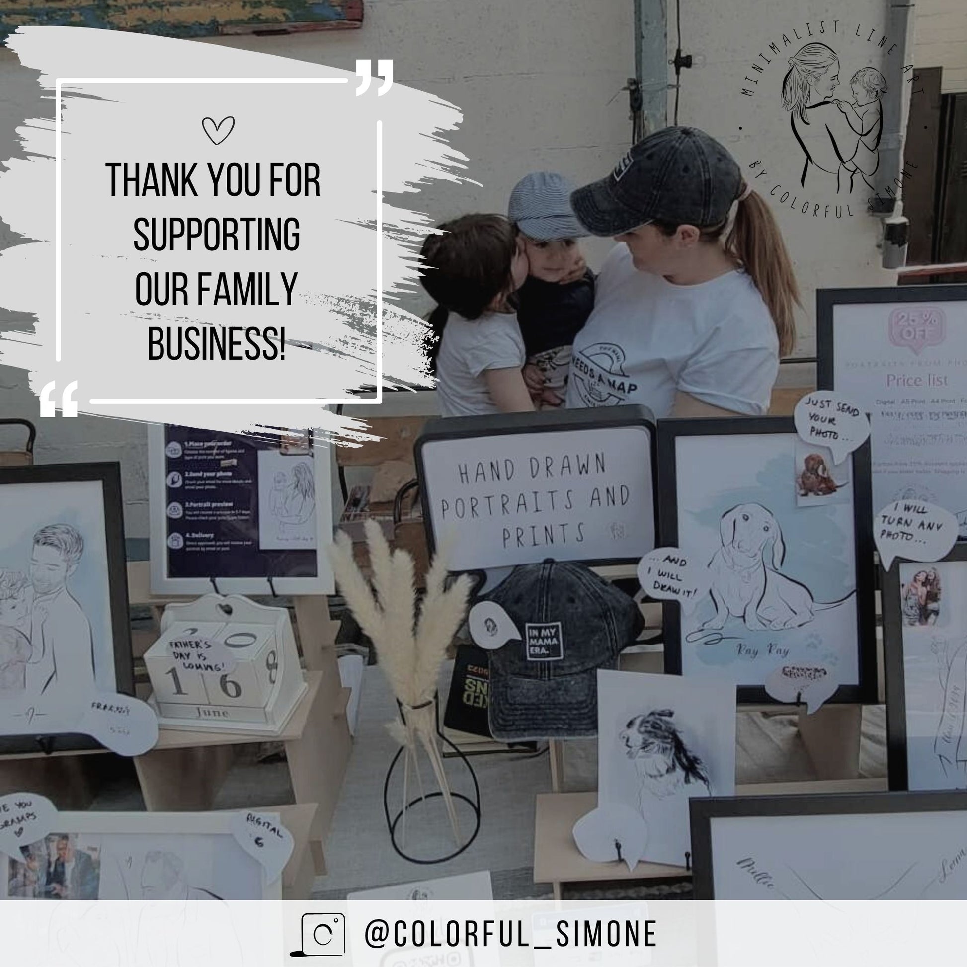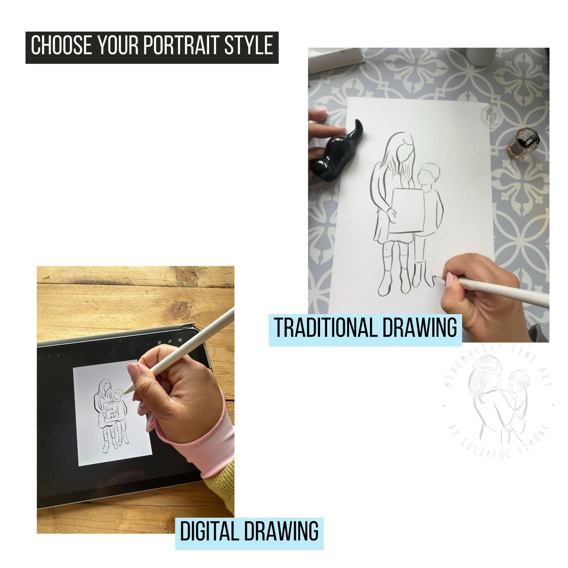 Each illustration is lovingly created by hand in my unique line art style, based on a photo you upload as reference. You can choose between: